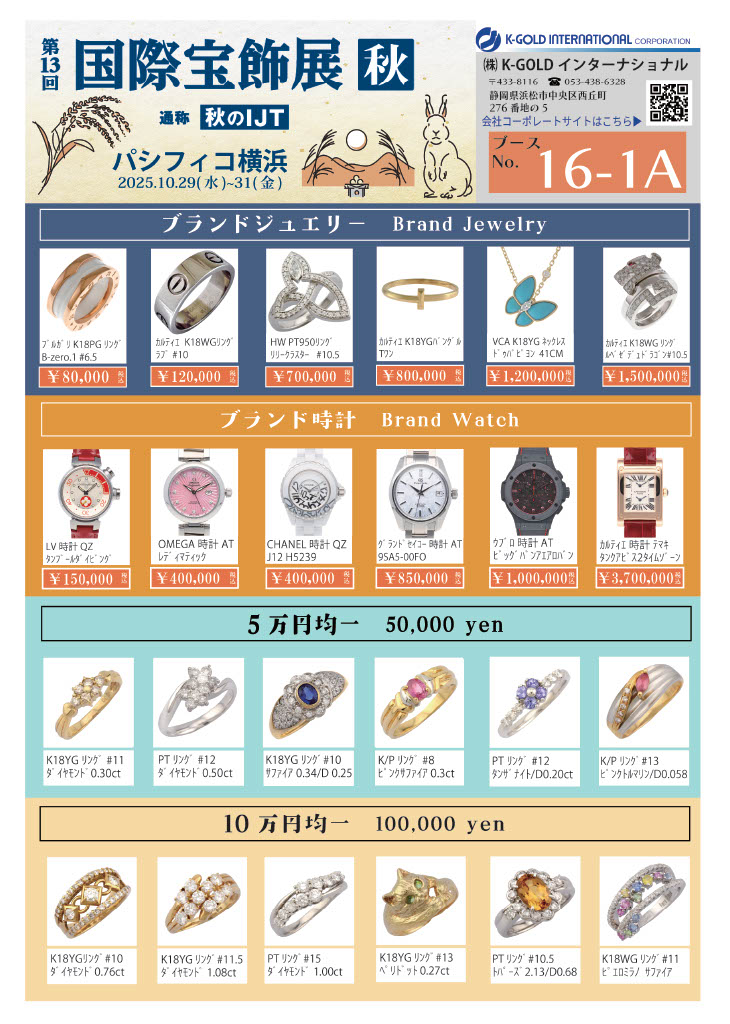 2025.10.29-31 パシフィコ横浜で行われる 第13回国際宝飾展 秋 【通称 秋のIJT】に参加いたします。 ブース番号:16-1A